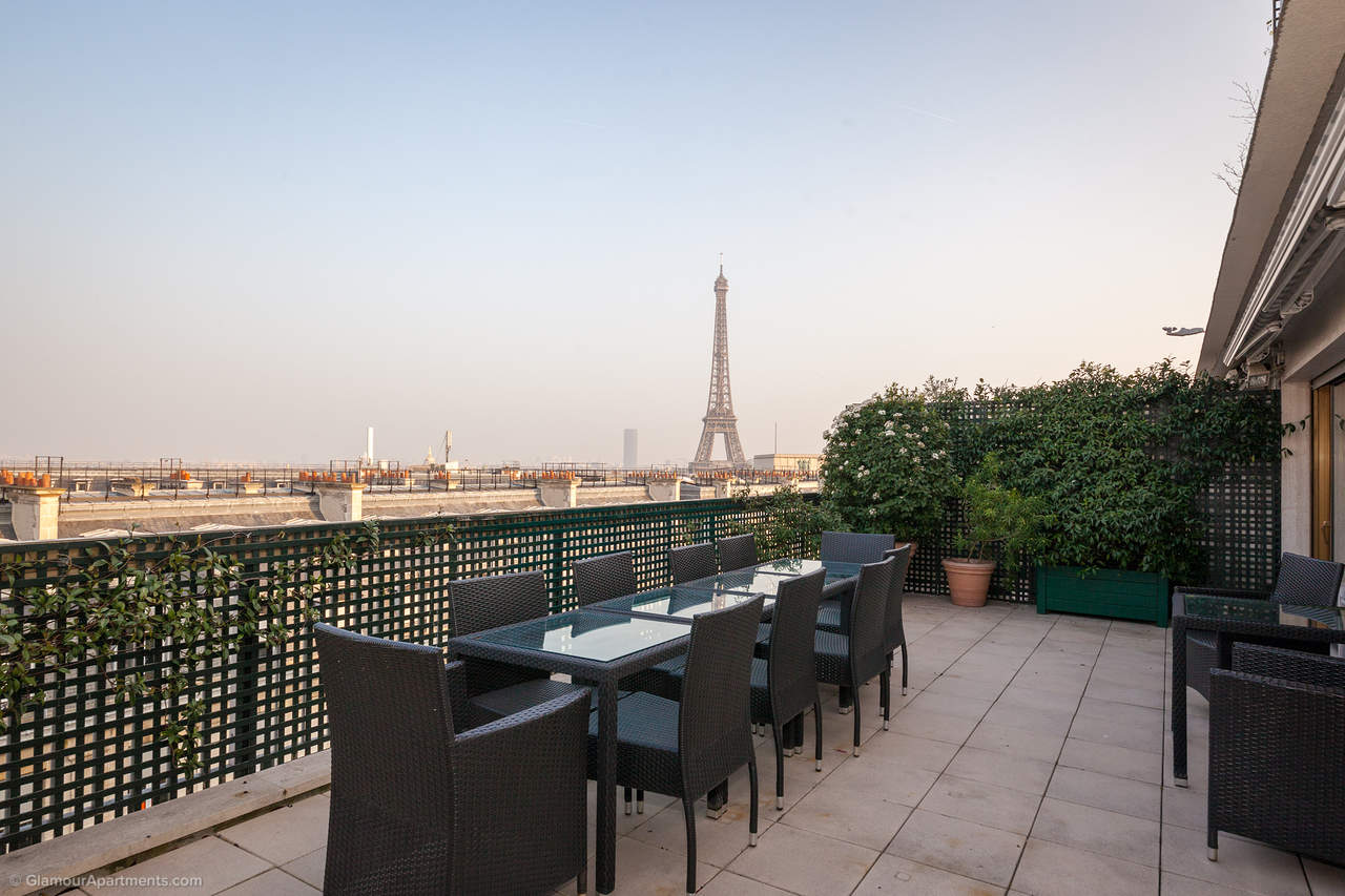该公寓的布局: 大客厅/餐厅,有转角沙发、电视、咖啡桌,用餐空间有六人桌和椅子; 走廊采用浅色调; 设备齐全的厨房,有一张餐桌; 阳台上有桌子、椅子、扶手椅、活的植物,可以看到埃菲尔铁塔的凉爽景色; 两间带双人床的卧室; 两间浴室。